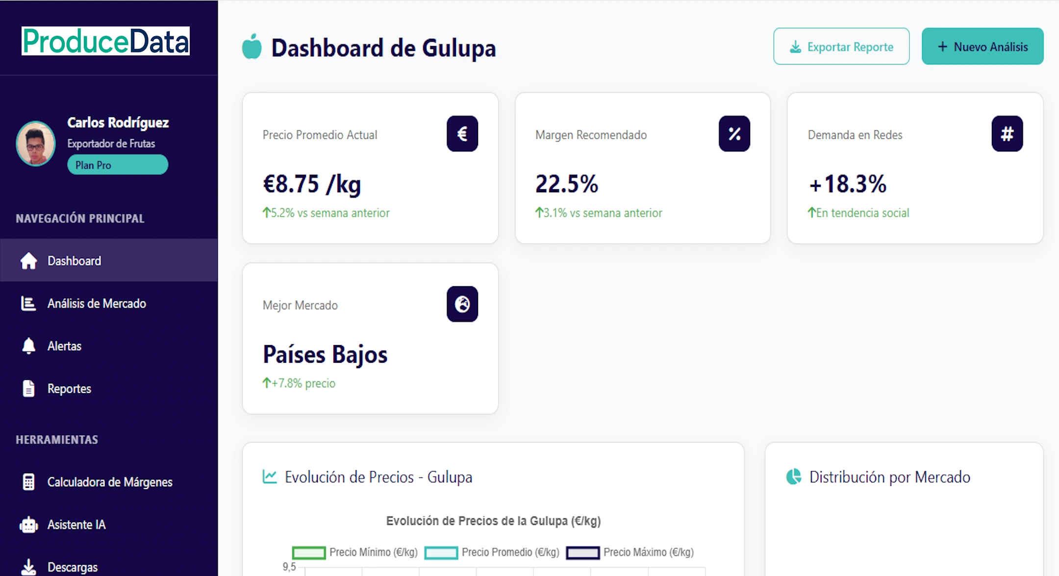 - Plan Scale Up (usd$213/mes): Para escalar en el mercado (Precio todas las frutas exóticas, Todos los mercados + Actualización en tiempo real + IA predictiva)