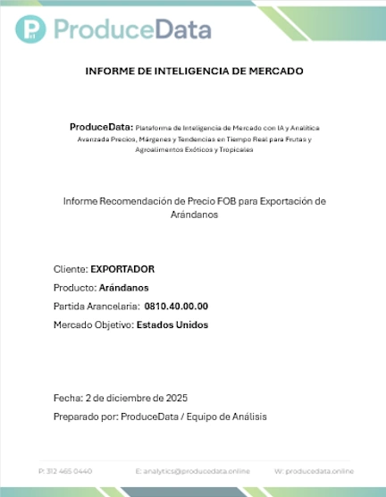 Informe recomendación de precio FOB (Franco a Bordo) y CIF (Costo, Seguro y Flete) para Exportación de Arándanos.