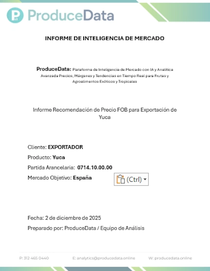 Plataforma de inteligencia artificial para exportadores de frutas tropicales que predice precios internacionales en tiempo real y optimiza márgenes de venta..